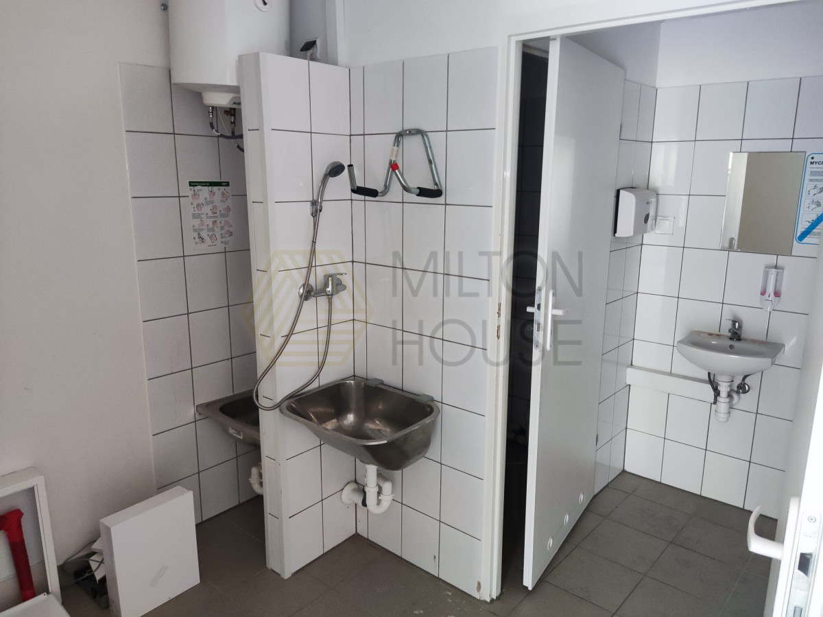- Aktualnie: sala sprzedaży ok. 60 m² + zaplecze: 13,5 m², 6,8 m², WC 3 m².