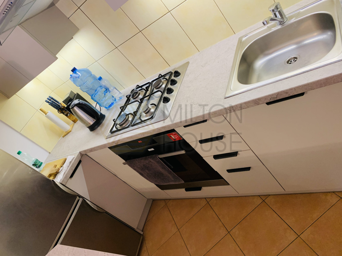 W pokoju znajduje się rozkładany narożnik, stolik kawowy, stół z krzesłami, komoda i półka. Aneks kuchenny wyposażony jest w zabudowę, piekarnik, płytę gazową, okap oraz lodówkę z zamrażarką. W łazience do dyspozycji najemcy jest pralka, a w przedpokoju szafa. Na balkonie znajduje się stolik z krzesłami.
